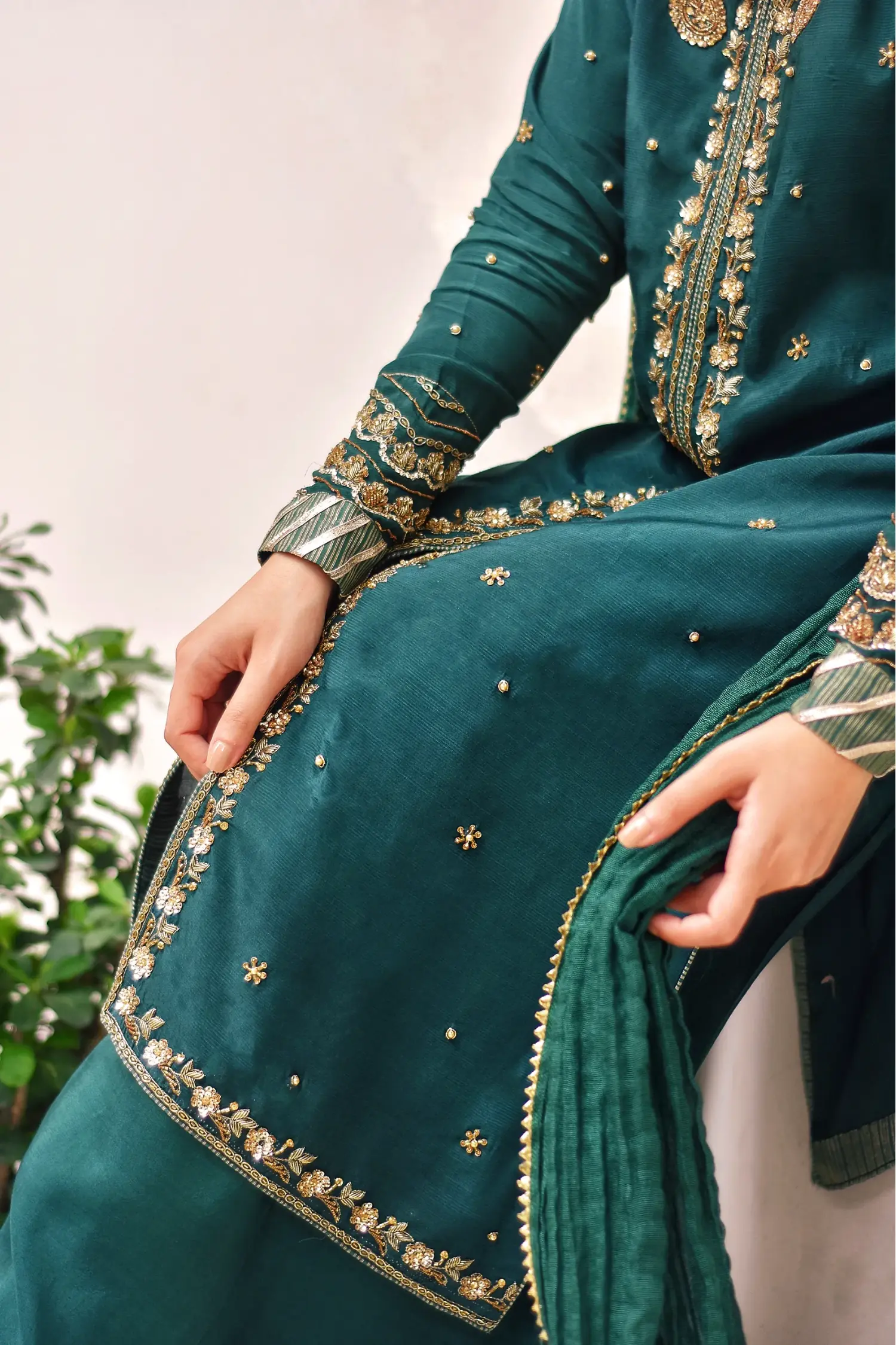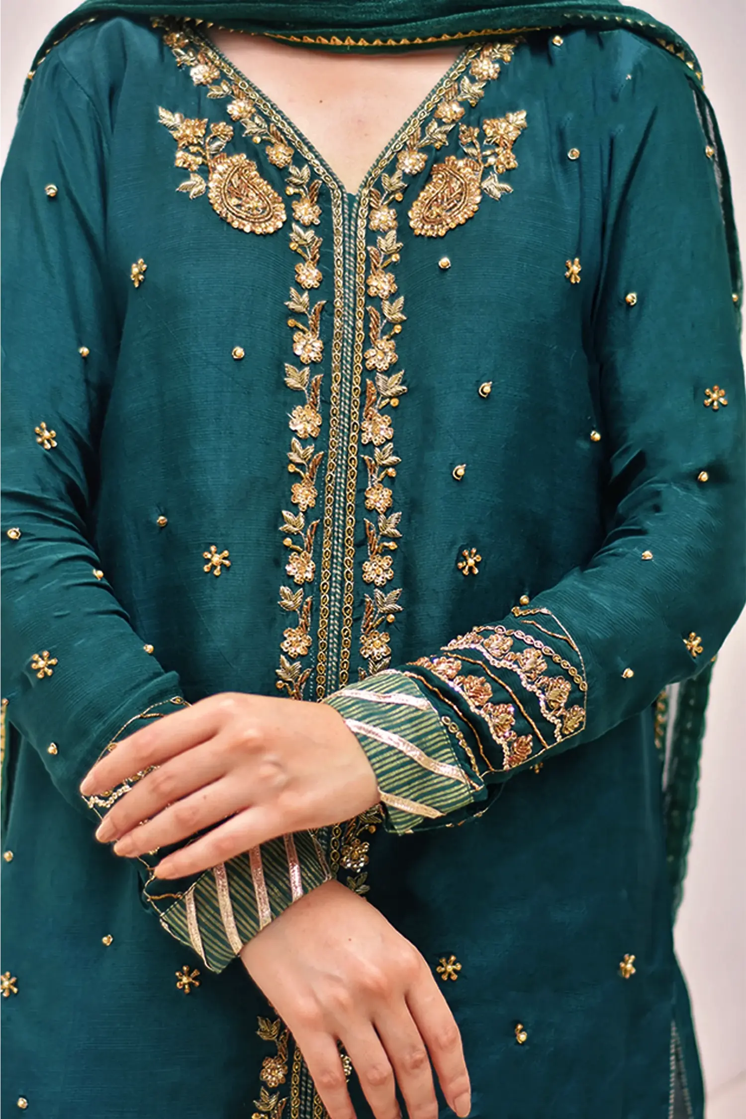 Handworked adda detailing with sitara, dabka, and naqshi