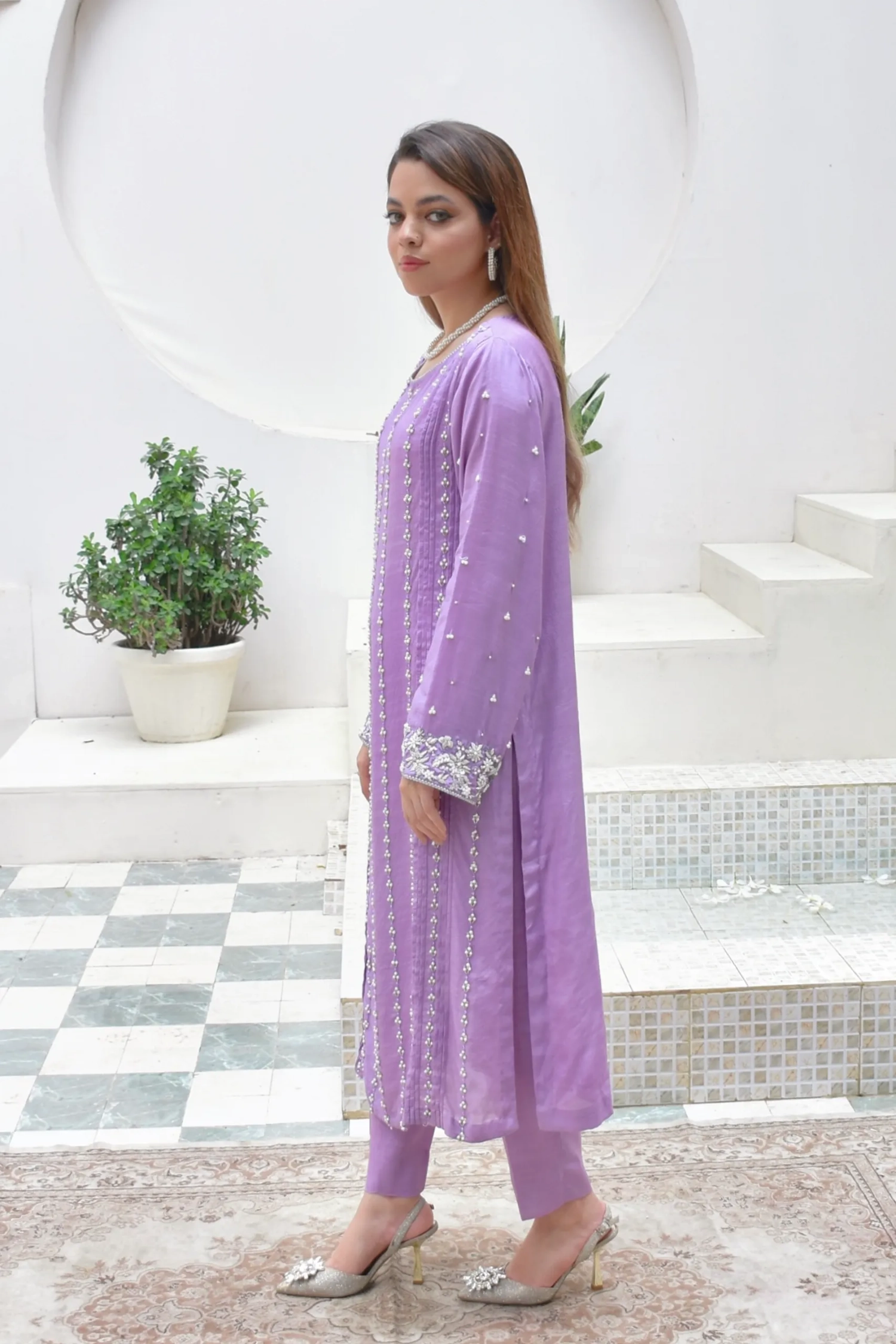 This ethereal lilac ensemble showcases a fully embellished raw silk shirt with intricate handwork gracing the front, back, and sleeves. Paired with straight viscose trousers and an organza dupatta adorned with delicate pearl work and a richly embellished border, this outfit radiates festive elegance.