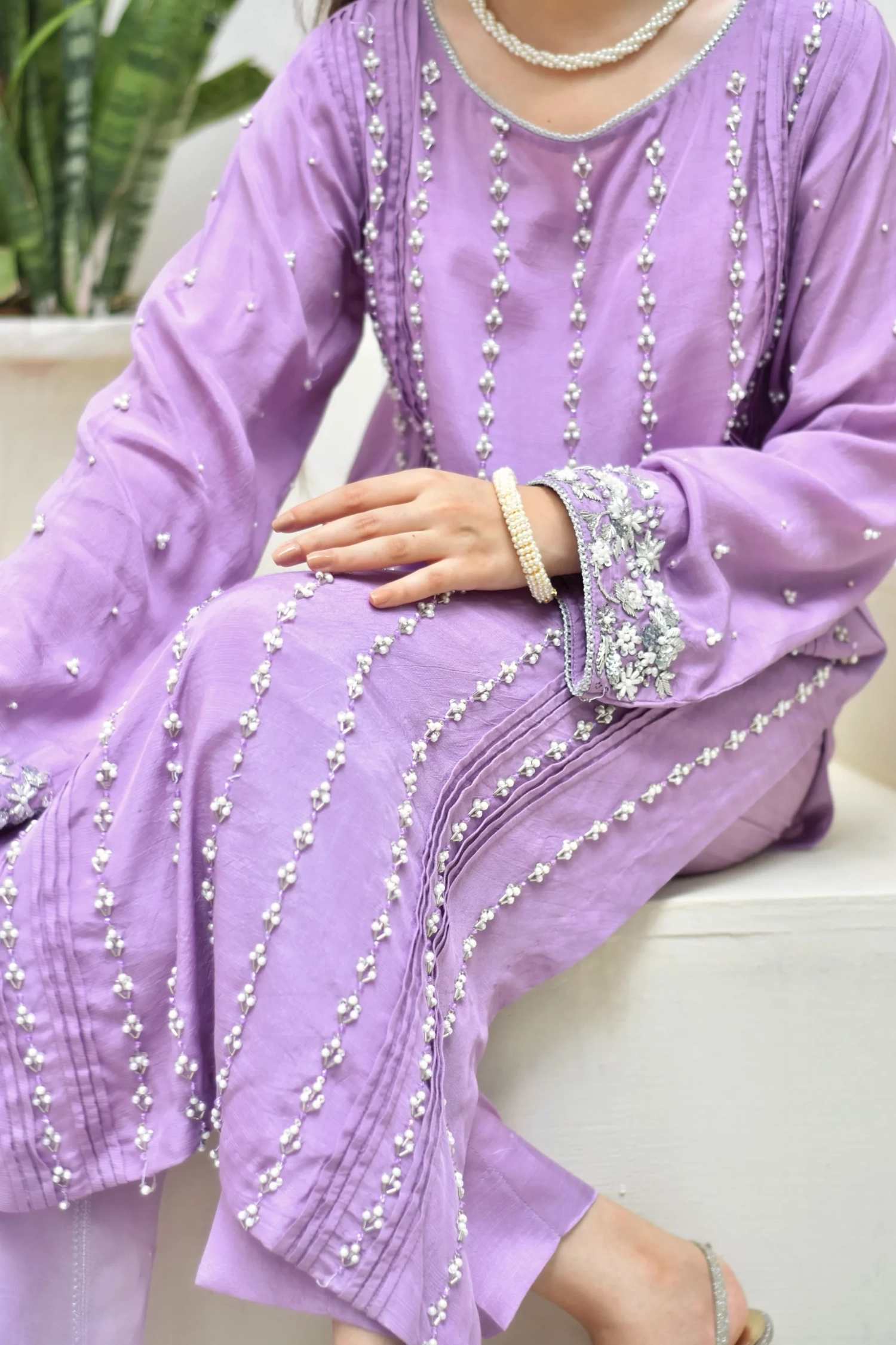 Handworked pearl embellishments with detailed sleeve borders